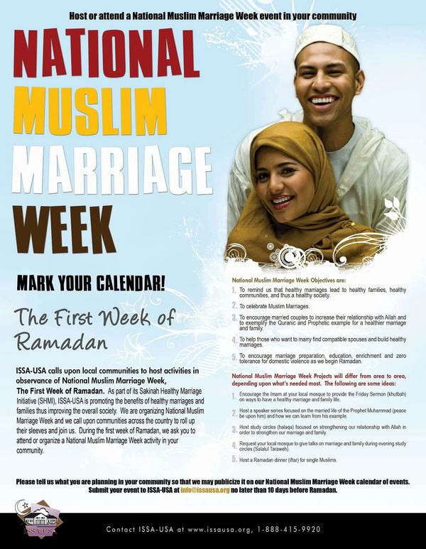 National Muslim Marriage week is marked yearly during the first week of Ramadan. Please check out the flyer for why and how your local community can participate with its own activities!